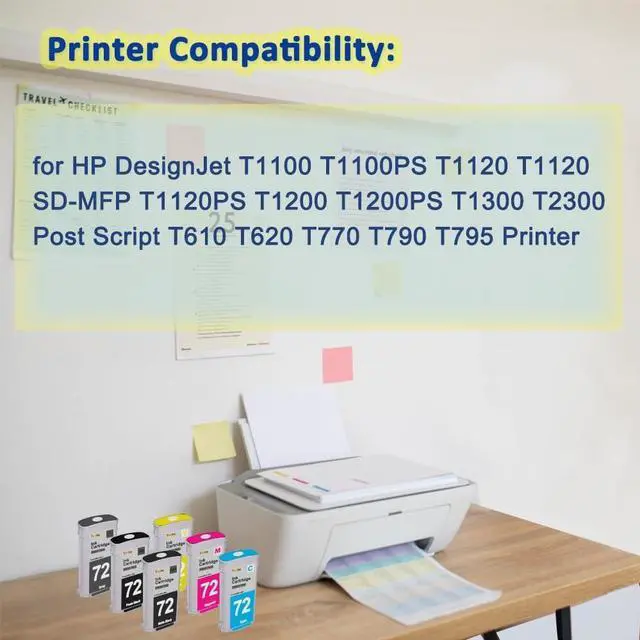 "Package Contains (Compatible) : 6 Pack of compatible ink cartridges replacement for HP 72 ink cartridges. (1 x Matte Black, 1 x Photo Black, 1 x Cyan, 1 x Yellow, 1 x Magenta,1 x Gray) Printer Compatibility : for HP DesignJet T1100 T1100PS T1120 T1120 SD-MFP T1120PS T1200 T1200PS T1300 T2300 Post Script T610 T620 T770 T790 T795 Printer WhyChoose Us : High Page Yield: 72 (Black) is 130-ml per cartridge. 72 (Cyan/Magenta/Yellow) is 130-ml per cartridge. ( at 5percent coverage ) Easy to Install: 1. Remove the PULL tape 2.Install into the printer Do not touch the chip during installation. High Performance: Premium Quality Ink delivers high-quality Vivid Color and sharp text, high Performance Results. High Quality Control: 100percent printer test for each ink cartridge to ensure fullworking condition and a superior print quality. 100 percent Compatibility: Adopting the lastest smart chips. Shows accurate ink level. Printer Recognition without problems. Firm Packaging Packaging Protection keeps products away from possibility ofdamage during transportation and ensure your product arrive safely. Tips: 1. Please clean the printing head before printing. 2. If the cartridges do not be recognized by your printer: (1) Please remove the cartridges and turn off your printer. Wait about 30 seconds and turn your printer back on. (2) Re-install the cartridges again and make sure all cartridges are individually well locked in."