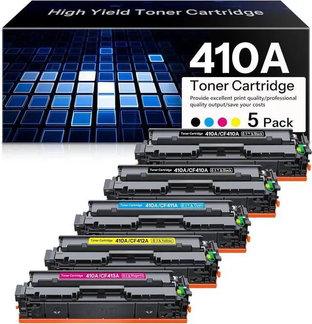 Package Contents : 410A Toner Cartridges: 2 black, 1 cyan, 1 magenta, 1 yellow.