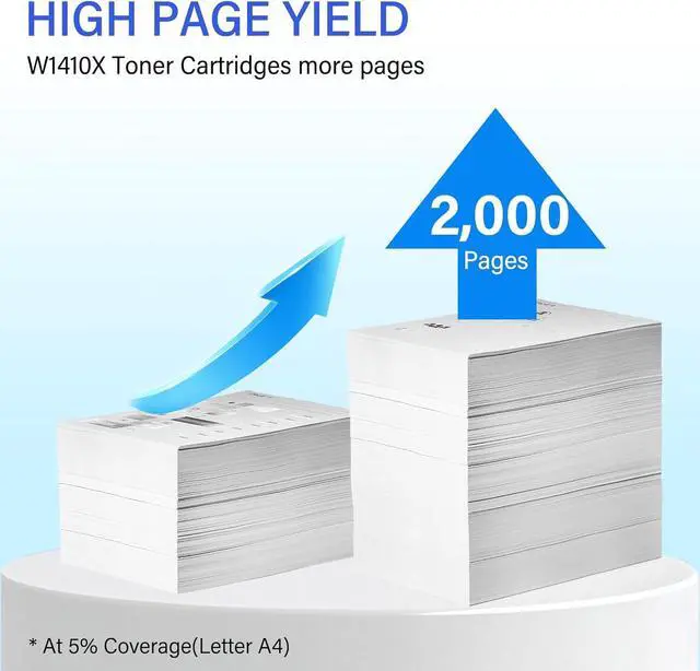 Printers with our toner are unable to display the amount of toner remaining, but this does not affect print quality or page yield.Estimated yield to 2,000 pages per W1410X toner cartridge (under condition of 5% coverage in A4 paper). Meet in the requirement of ISO/IEC 19752