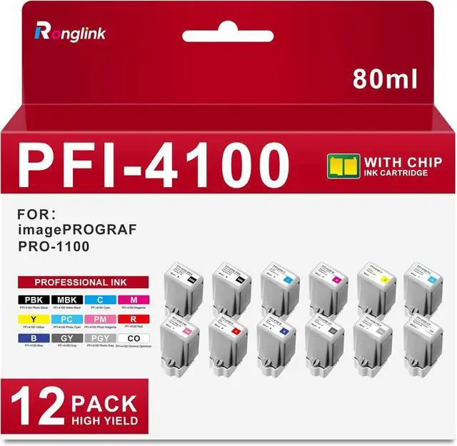 Package includes: 1 x PFI-4100MBK matte black, 1 x PFI-4100PBK photo black, 1 x PFI-4100C cyan, 1 x PFI-4100Y yellow, 1 x PFI-4100M magenta, 1 x PFI-4100CO chroma optimizer, 1 x PFI-4100PC photo cyan, 1 x PFI-4100PM photo magenta, 1 x PFI-4100R red, 1 x PFI-4100BL blue, 1 x PFI-4100GY gray, 1 x PFI-4100PGY photo gray replacement for Canon PFI-4100 ink, PFI4100 ink.