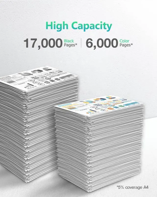 Page Yield: Approximately 17,000 pages per black toner, 6,000 pages per color toner at 5% coverage of A4/letter.