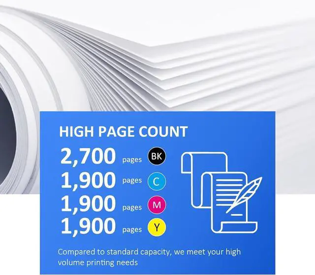 Each black cartridge can print up to 2,700 pages, and each color cartridge can print up to 1,900 pages at 5% coverage on both letter and A4 size paper