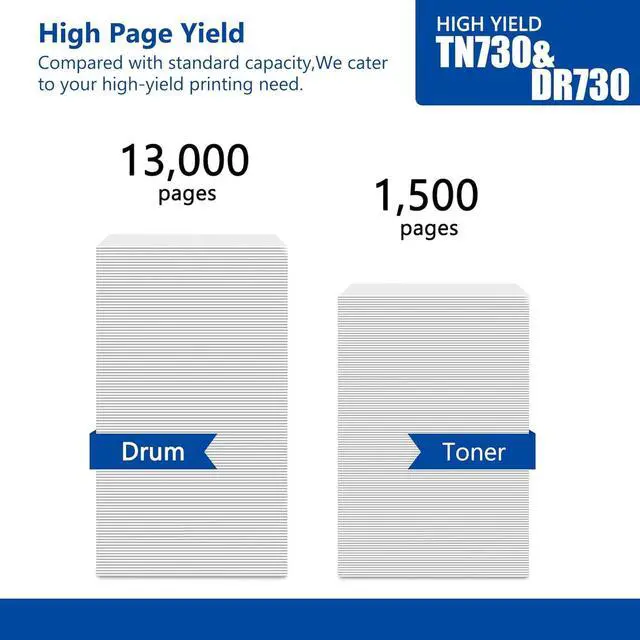 High Page Yield: 1,500 pages per TN730 Toner Cartridge and 13,000 Pages per Drum Unit at 5% coverage