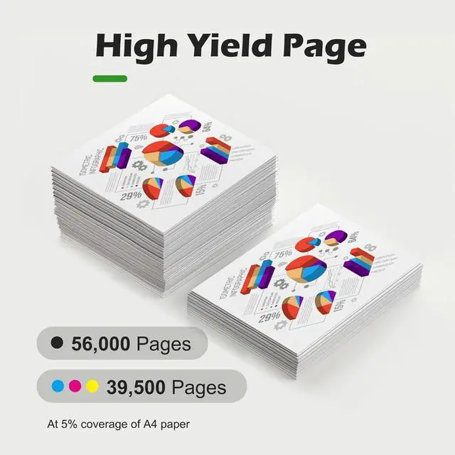 High Page Yield : Up to 56000 pages per black toner cartridge,39500 Pages per cyan magenta yellow at 5% coverage on letter a4