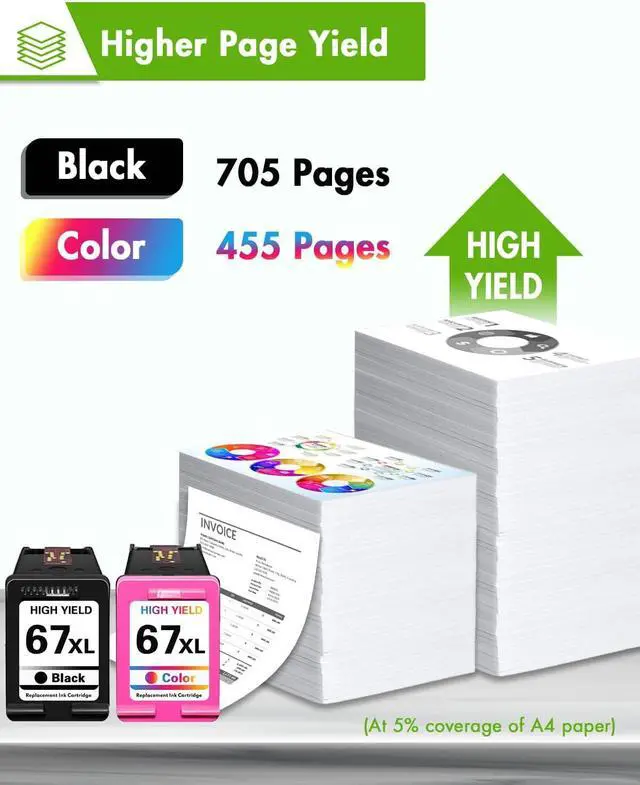 High Page Yield: Prints up to 705 pages per 67XL Black ink cartridges, up to 455 pages per 67XL Tri-color ink cartridge (based on 5% coverage at A4 page)