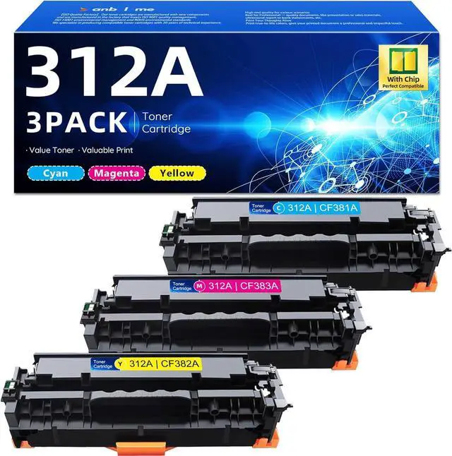 What's in the box: 1 x 312A cyan toner (CF381A) ,1 x 312A magenta toner (CF383A) ,1 x 312A yellow toner (CF382A) 3-Packs of 312A toner cartridges with chips