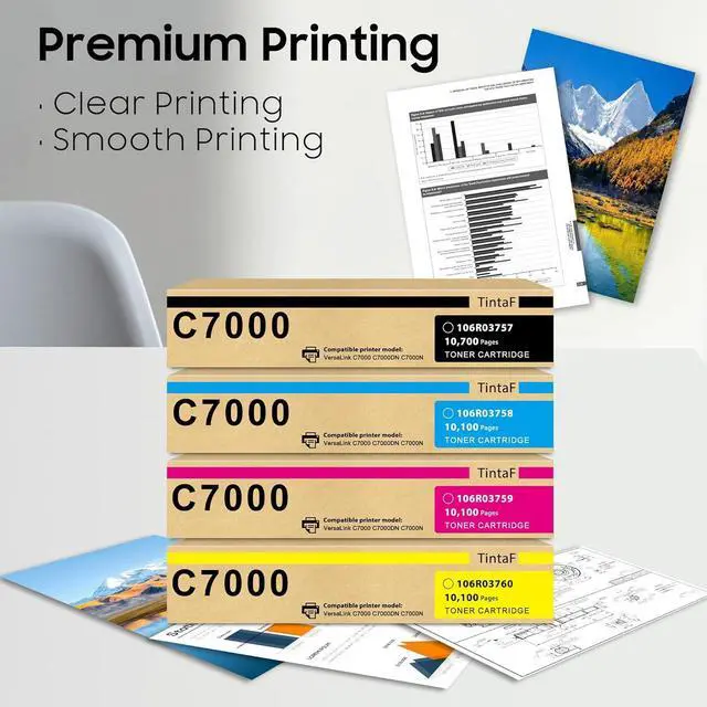 TintaF C7000 toner cartridge with 4 color, including 1x Black (106R03757), 1x Cyan (106R03758) , 1x Magenta (106R03759), 1x Yellow (106R03760), which continue to provide you with high print volume, and smooth printing experience
