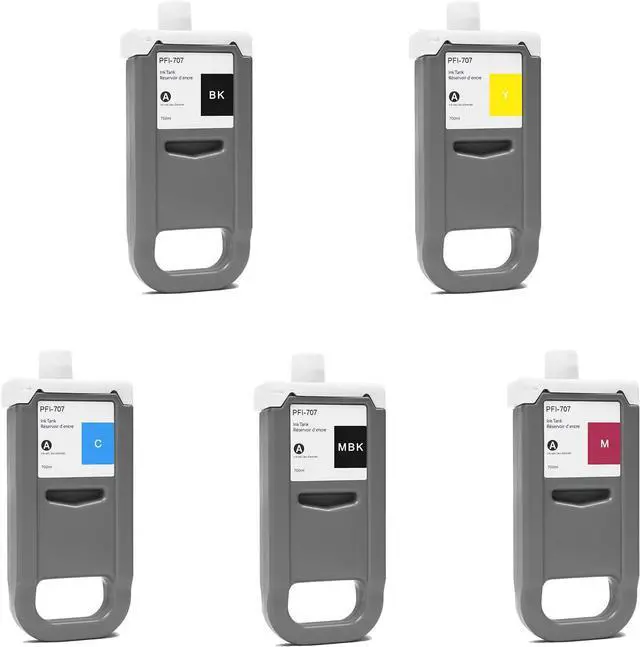 Package Contents: PFI-707 Ink Cartridge 5-Pack, Including 1 X PFI-707Matte Black (9820B001) 1 X PFI-707Black (9821B001) 1 X PFI-707Cyan (9822B001) 1 X PFI-707Magenta (9823B001) 1 X PFI-707Yellow (9824B001) Each with a 700ml Capacity