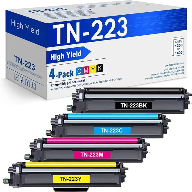 Product Content: TN-223BK/C/M/Y Toner Cartridge Including 1 x TN223BK Black Toner, 1 x TN223C Cyan Toner, 1 x TN223M Magenta Toner, 1 x TN223Y Yellow Toner( Total 4 Pack TN223 Toner Cartridges)