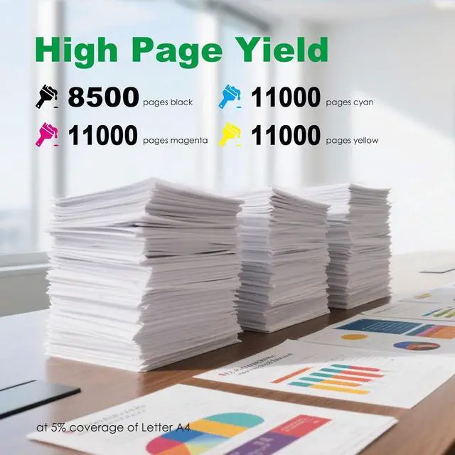 Page Yield:Up to 8,500 pages per black toner cartridge,11,000 pages per color toner cartridge Based on 5% coverage of Letter/A4.