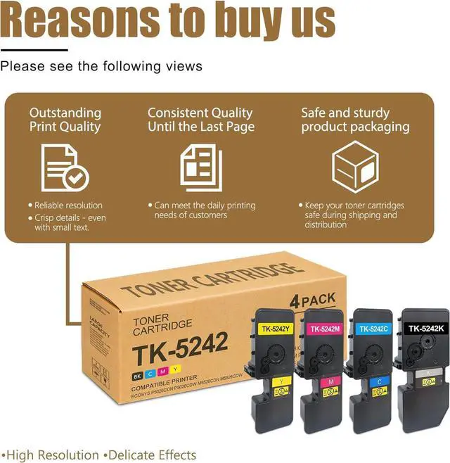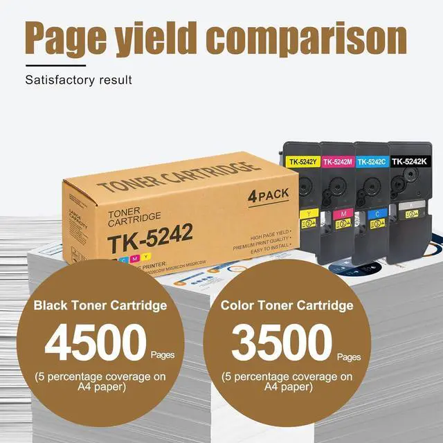 In this Package: 4 Pack TK-5242 Toner Cartridges set includes 1 x TK-5242K Black Toner cartridge,1 x TK-5242C Cyan Toner cartridge,1 x TK-5242M Magenta Toner cartridge,1 x TK-5242Y Yellow Toner cartridge