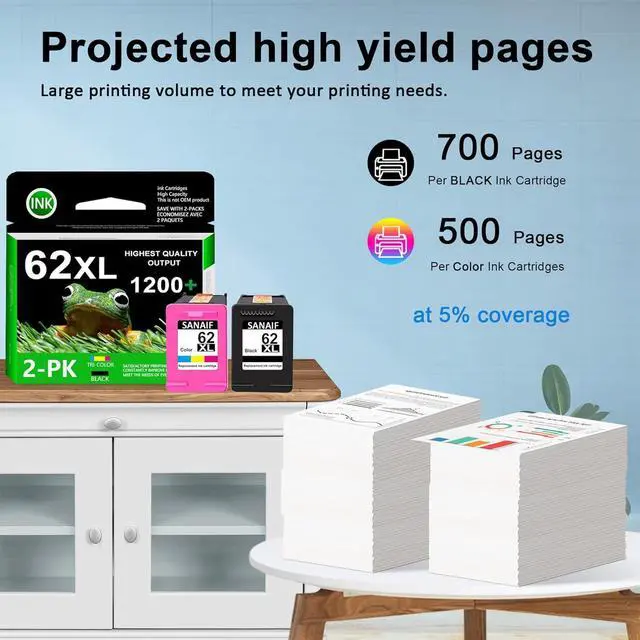 Cartridge Yield (approx.): Each black 62XL ink cartridge can print up to 700 pages, and each color ink cartridge can print 500 pages