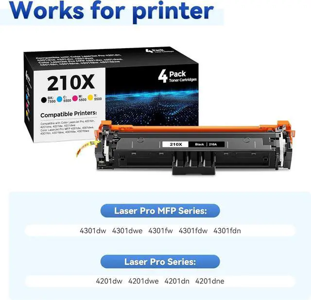 Package Contents: 4-Pack 210X W2100X Toner Cartridge with chip. Compatible with HP 210X 210A Toner Cartridges. Color: Black/Cyan/Magenta/Yellow