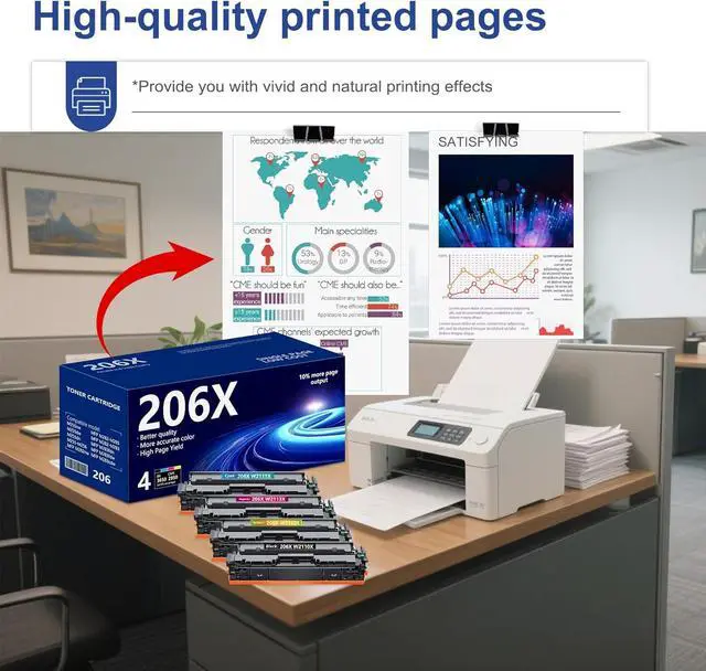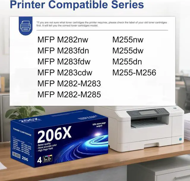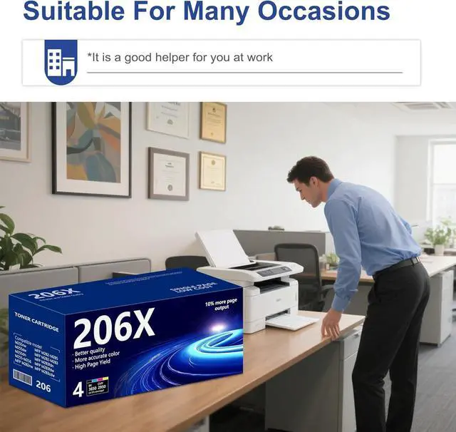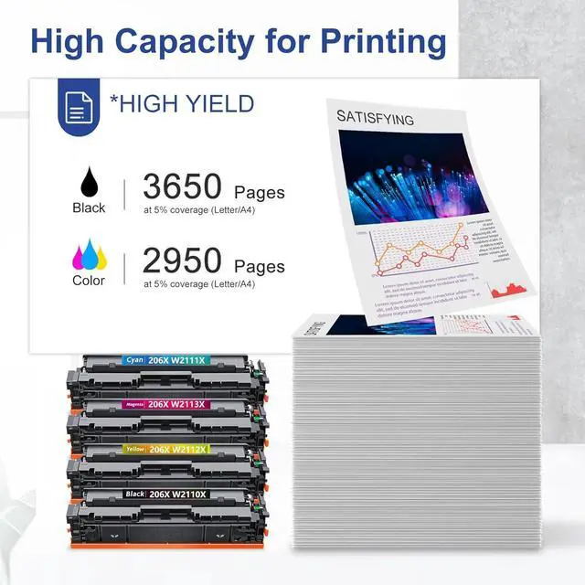 High-yield performance: 206X black toner: 3,650 pages, color toner (cyan/yellow/magenta): 2,950 pages each, based on 5% coverage (Letter/A4), reduces replacement frequency and ensures long-lasting use