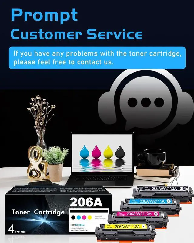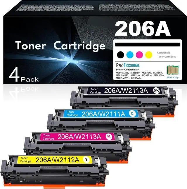 Package Contents: 4 Packs 206A toner cartridges contain 1 x W2110A 206A black toner cartridge, 1 x W2111A 206A cyan toner cartridge, 1 x W2112A 206A yellow toner cartridge, 1 x W2113A 206A magenta toner cartridge