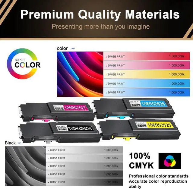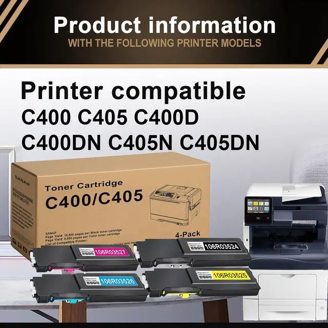 Package Contents: Compatible Xerox SANAIF C400/405 high capacity toner cartridge Black Cyan Magenta Yellow 4-Pack (106R03524 106R03525 106R03526 106R03527)