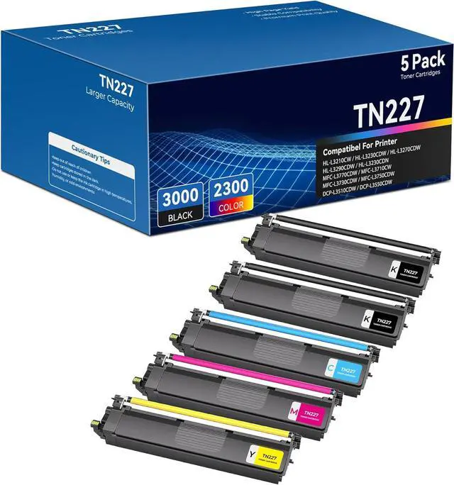 Package Contents: 2x tn227 HL-L3210CW black toner, 1x tn227 HL-L3210CW cyan toner, 1x tn227 HL-L3210CW magenta toner, 1x tn227 HL-L3210CW yellow toner Replacement for tn-227 Toner. (TN227 is high yield version of TN223 and packaging version may vary)