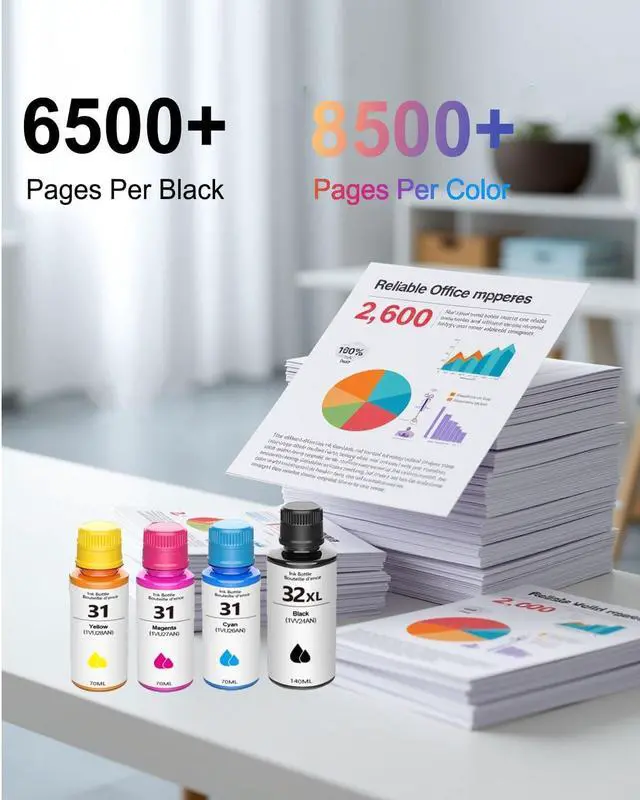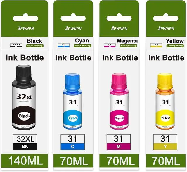 Package Includes: 31 32XL Ink Bottle Set 4 Pack includes 1 x 32XL(1VV24AN)140ml Black dye ink,1 x 31(1VU26AN) 70ml Cyan dye ink,1 x 31(1VU27AN) 70ml Magenta dye ink,1 x 31(1VU28AN)70ml Yellow dye ink