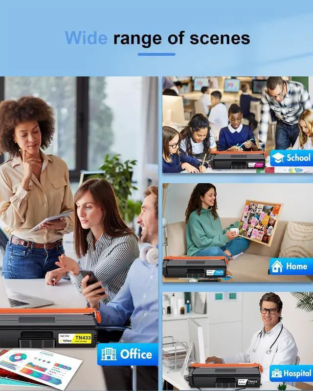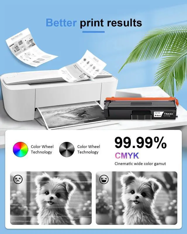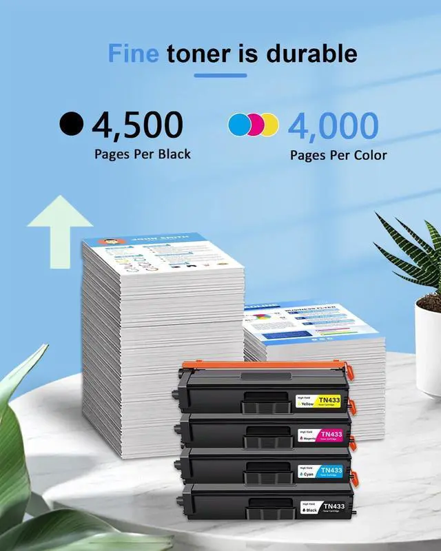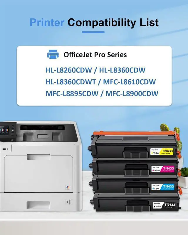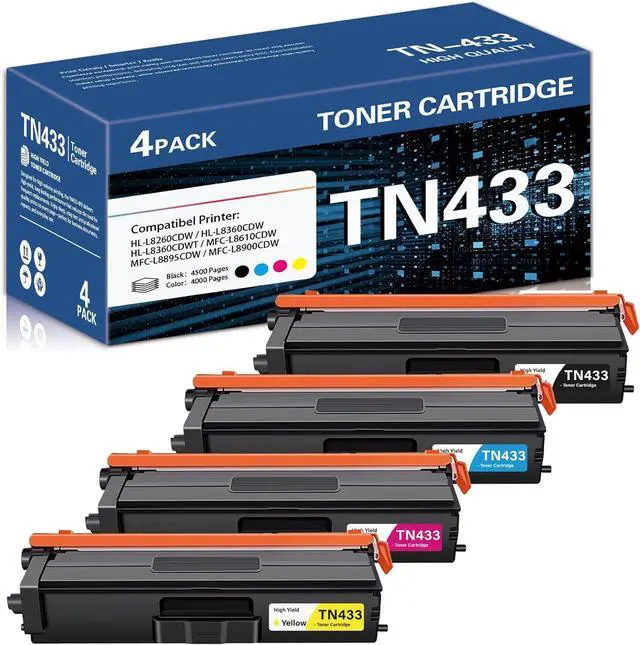 Package Contents: 4 Pack new high-yield TN433 toner cartridges (1Black/1Cyan/1Magenta/1Yellow)