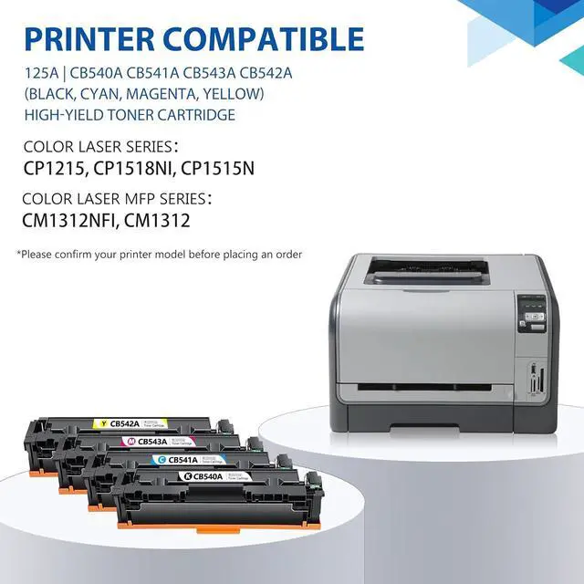 What's in the box: 4 new 125A | CB540A, CB541A, CB542A, CB543A Toner Cartridges Set with Chip 4-Pack