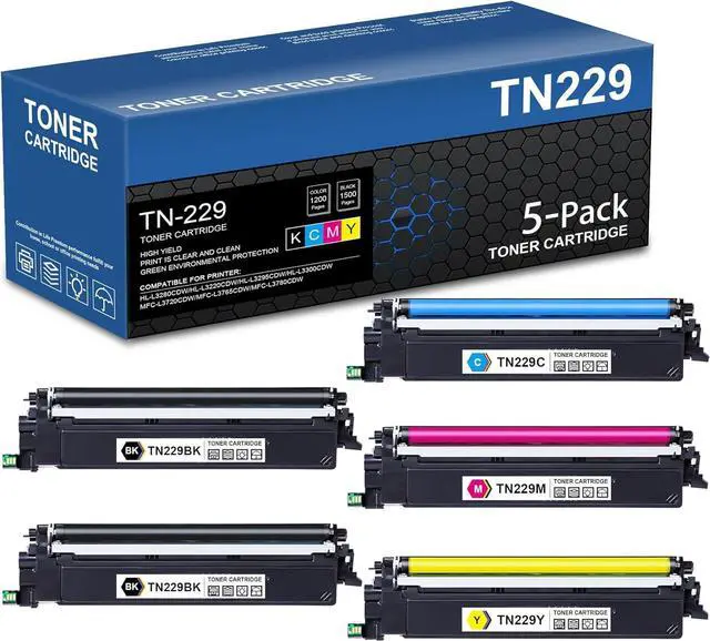 Package Contents: 2x TN229 Black toner, 1x TN229 Cyan toner, 1x TN 229 Magenta toner, 1x TN 229 Yellow toner, total 5 pack of high yield TN229 toner cartridges