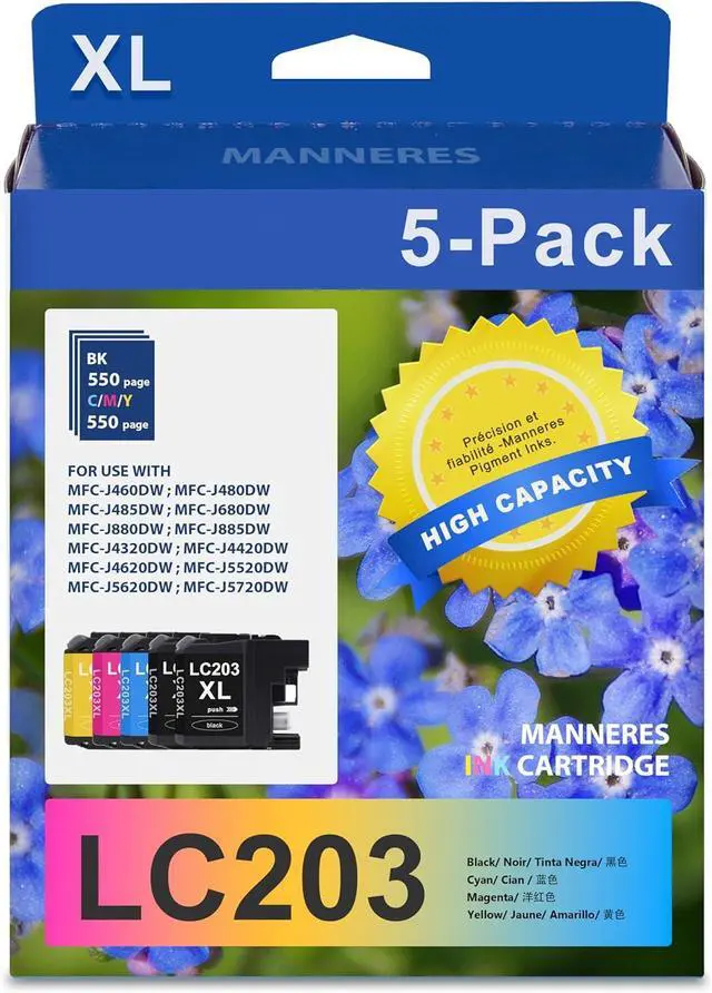 Package Includ: LC203XL Ink cartridge (5 Pack, 2BK/1C/1M/1Y) replacement for Brother lc203xl / lc201xl ink cartridges