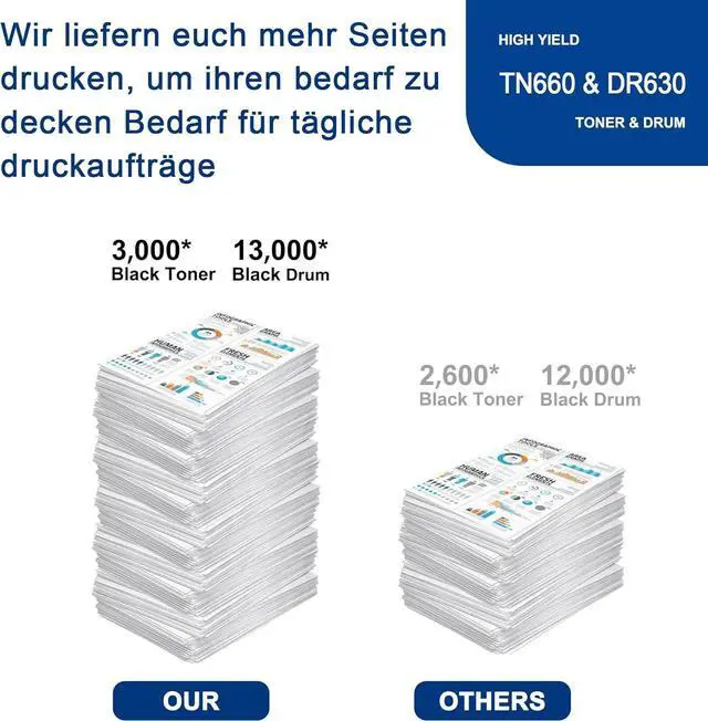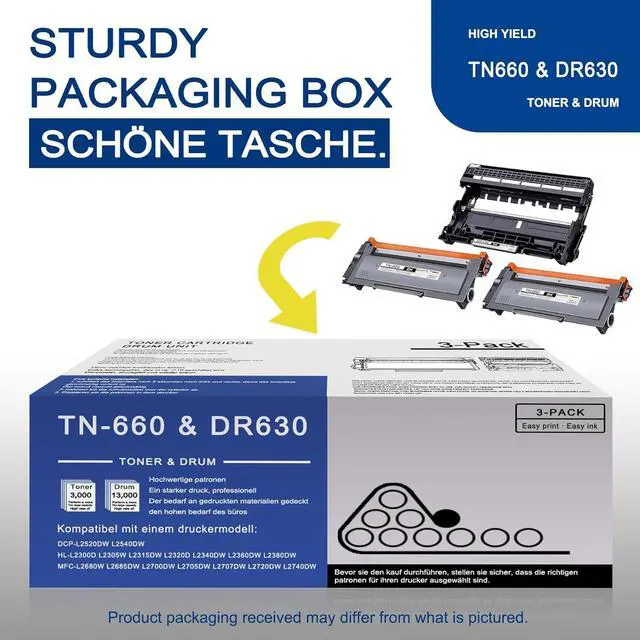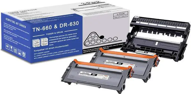 2 Pack TN660 Black Toner Cartridge & 1 Pack DR630 Black Drum Unit High Yield Replacement for Brother TN660 & DR630.