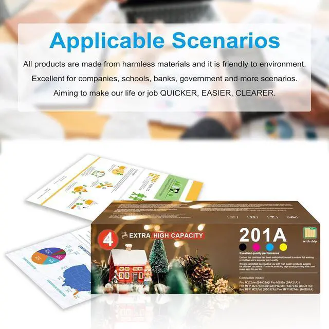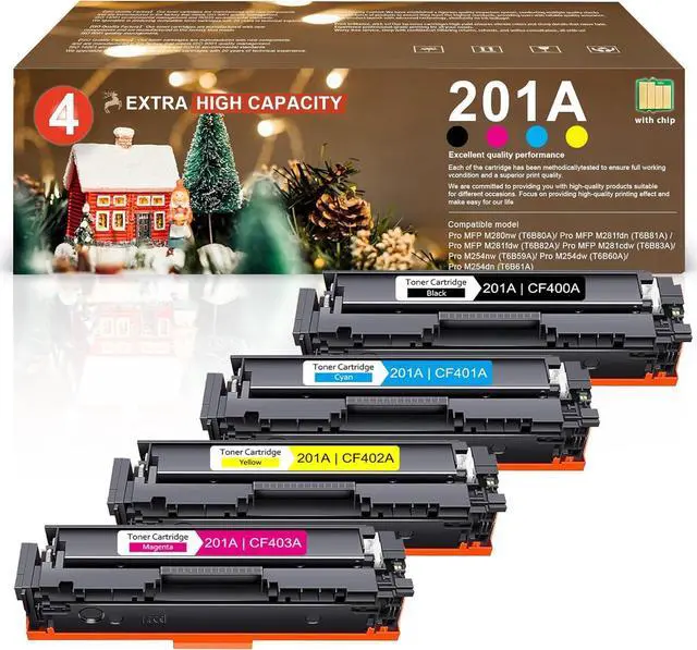 Includes: 1 pack black toner cartridge (CF400A), 1 pack cyan toner cartridge (CF401A), 1 pack yellow toner cartridge (CF402A), 1 pack magenta toner cartridge (CF403A), for a total of four 201A toner cartridges