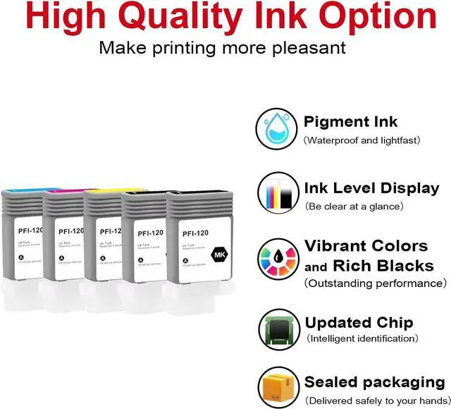 Package contents: 5 Packs of PFI-120 Ink Cartridge (1 Black 1 Matte Black 1 Cyan 1 Magenta 1 Yellow)