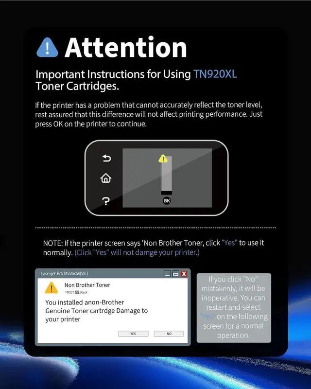 Attention: 1. If the printer prompts Non Brother Toner, please click Yes for normal use. 2.If the printer prompts 445 or Cartridge Error446, please restart the printer for normal use.