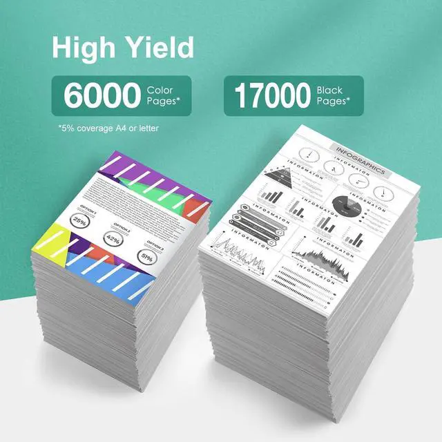 High Yield: 17,000 pages per Black, 6,000 pages per Color at 5% coverage of letter/A4.