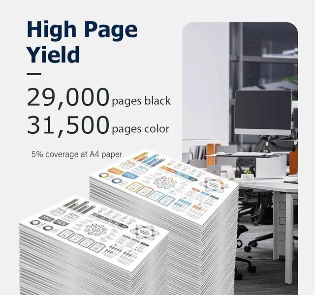 Page Yield: Approximately 29,000 pages per Black Toner Cartridge, 31,500 pages per Color Toner Cartridge ( All at 5% coverage).