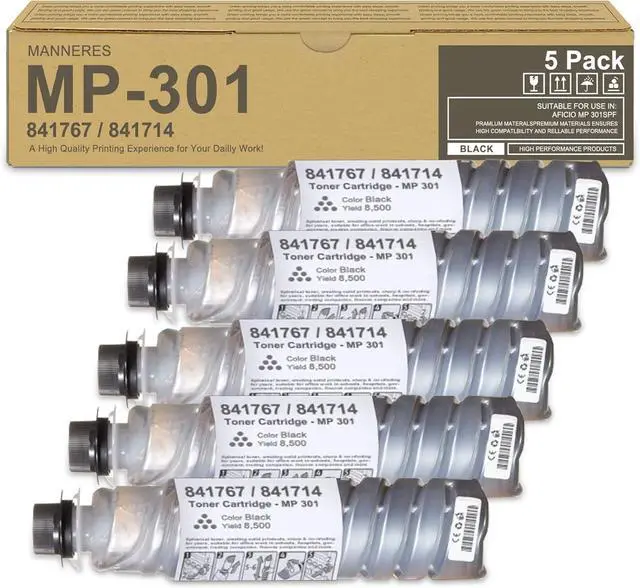 The product includes: 5-Pack MP301 1841767 / 841714 Black Toner Cartridge