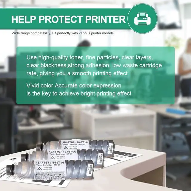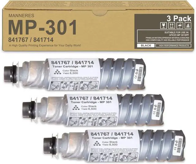 The product includes: 3-Pack MP301 1841767 / 841714 Black Toner Cartridge