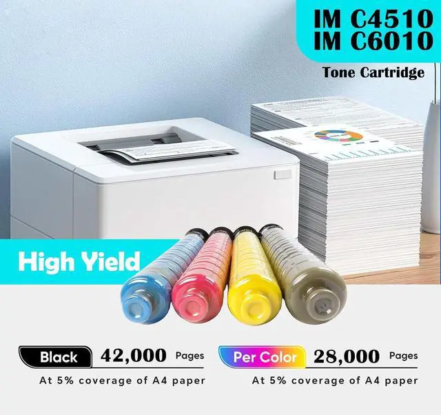 Page Yield:42,000 pages for IM C4510 Black toner cartridge, and 28,000 pages each for IM C4510/IM C6010 Cyan,Yellow, Magenta toner cartridges,at 5% coverage on A4 paper