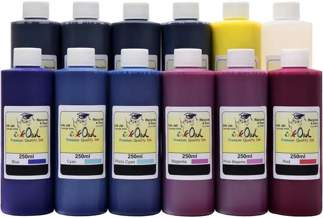 Product contents: 12x250ml Ink Owl premium pigment-based ink (blue, cyan, gray, magenta, matte black, photo black, photo cyan, photo gray, photo magenta, red, yellow, and chroma optimizer), 12 injector sets for easy and comfortable refilling, detailed instruction sheet covering the whole process from start to finish
