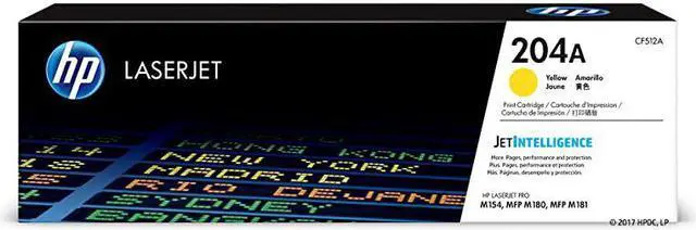 204A (CF512A) Yellow Toner Cartridge for LaserJet Pro MFP M180nw M154nw. 204A (CF510A) toner cartridges work with: LaserJet Pro MFP M180nw, M154nw. Original toner cartridges produce an average of 71% more usable pages than non- cartridges. 204A yellow toner cartridge yield (approx): 900 pages. 204A toner is designed to work with your printer for high quality, reliable results every print. Ensure that your printing is right the first time and every time with printer toner: 204A toner.