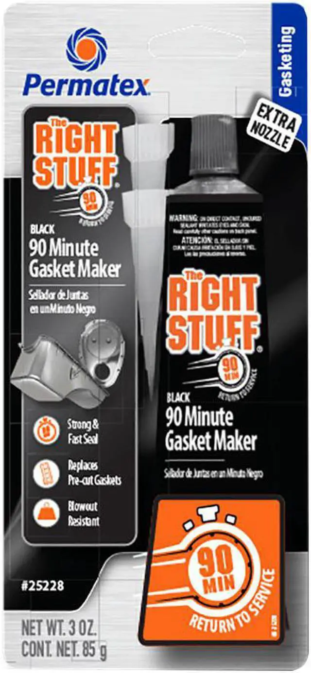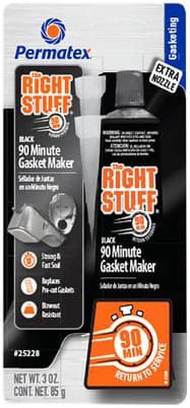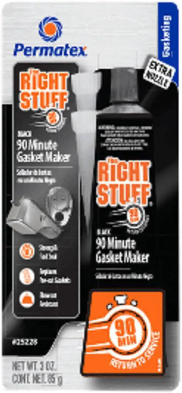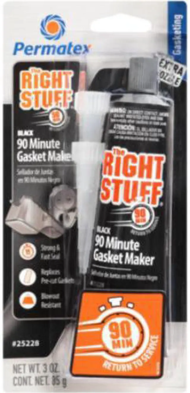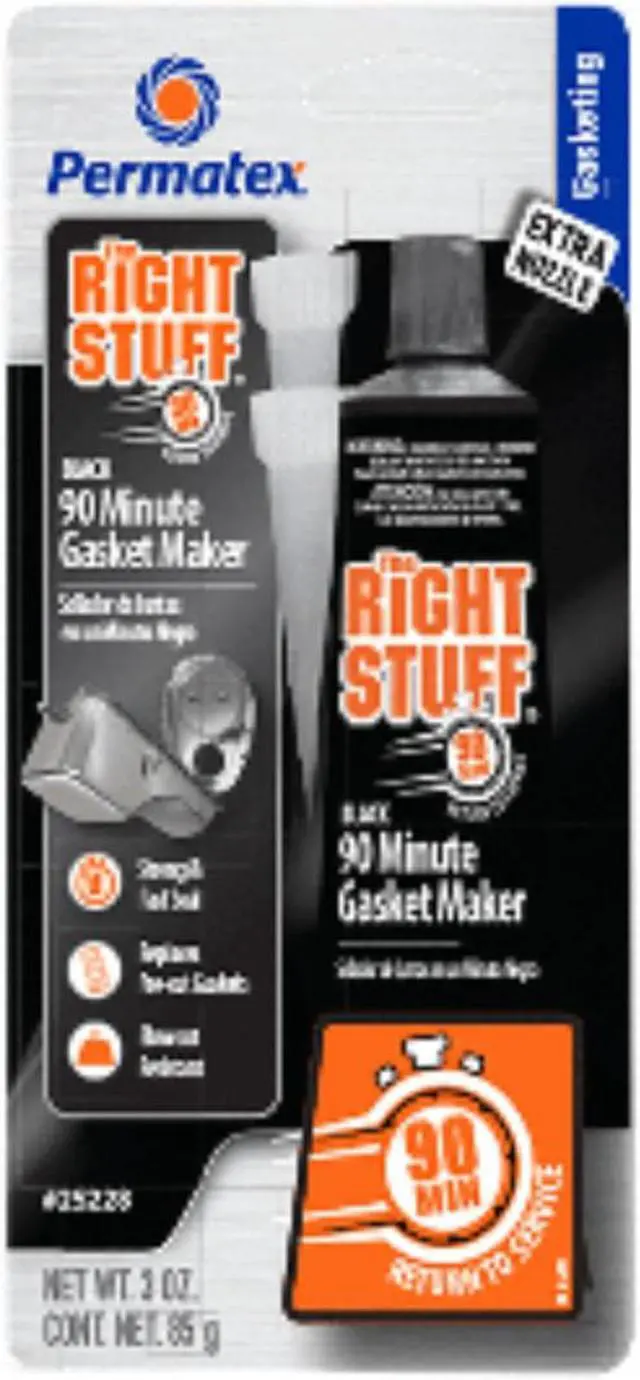 The Right Stuff® 90 Minute Gasket Maker Tube - BLACK - 3ozThe Right Stuff® 90 Minute is the only gasket maker in a tube that can return a vehicle back to service quickly – just 90 minutes curing time! It outperforms pre-cut gaskets by providing superior adhesion to flanges with maximum flexibility. A premium professional grade gasket maker for today’ s fast-paced professional garage and heavy DIY’ er. Temperature range -65°F to 500°F Intermittent. Compared to Permatex® the Right Stuff® GREY Gasket Maker our BLACK formula offers higher oil resistance and greater flexibility.