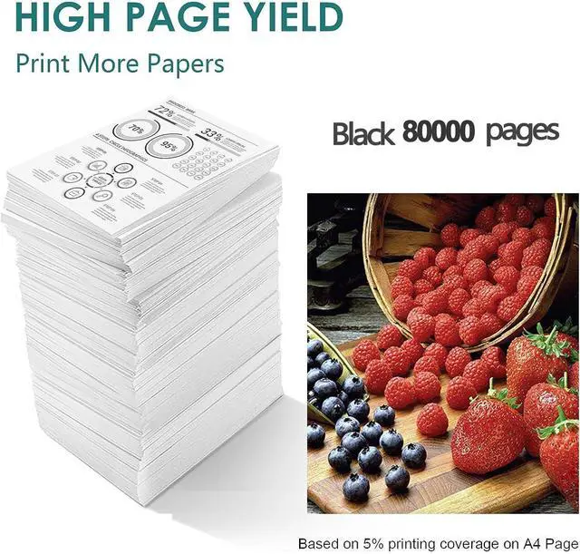 • ESTIMATED PAGE YIELD - Black is about 80000 pages (A4 paper 5% coverage)The number of pages printed is based on factors such as: consumable change intervals, paper loading intervals, speed and typical customer usage.