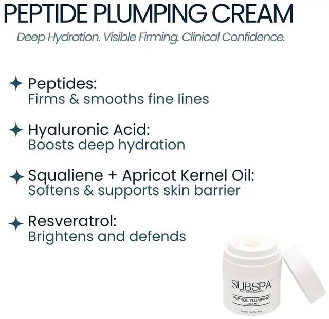 Clean, Clinical, and Safe for All Skin Types - Crafted in the USA in an FDA-registered 503B facility, SubSpas Peptide Plumping Cream is made under strict quality and safety standards. Its dermatologist-tested, non-comedogenic, fragrance-conscious, and free from parabens, sulfates, and harsh irritants. Whether you have sensitive, dry, combination, or mature skin, this cream is gentle enough for daily usemorning and night.