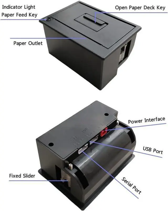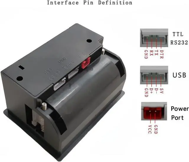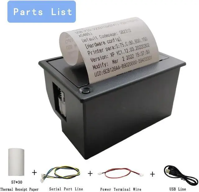 The printer power supply provided by this link is 5 9V; if you need a 12 24V power supply version, please email us after submitting the order, and we will deliver the 12 24V power supply version of the printer you need. The printer provides a physical interface of RS232/TTL+USB, the default is RS232, if you need to switch to TTL, you can contact us, we will tell you how to switch. This thermal printer prints clearly, and the paper bin can accommodate small paper rolls with a diameter of 30MM, which can be easily embedded in the detection instrument to realize the function of data printing. The printer can be connected to MCU, Android, Linux, Windows systems and other platforms, and Android provides a secondary development kit. It can easily print text, pictures, barcodes, QR codes, etc. Product packing list: Thermal printer*1; Power cord*1; Serial line*1; USB cable*1; Thermal paper roll*1; (specification 57*30) The thermal paper used by the printer is a common thermal receipt paper roll on the market, with a size of 57*30; Our thermal printer works well with a 5 9V3A power supply. Since the printer is mainly embedded in the device, it is equipped with a 2PIN power terminal cable. If an external power supply is required,You also need a 5 9V DC regulated power supply and a 2.1MM jack terminal block adapter for easier connection to the power adapter. We really like this printer because its easy to make Bold, underline , inverted text , variable line spacing, left/center/right justification, barcodes with adjustable height, and even custom QR code. To help you easily implement development, We edited a more common instruction set print example based on the instruction set, After submitting the order, we will send this print example and development materials to you by email.you can change what you need to print based on our example. Super convenient!
