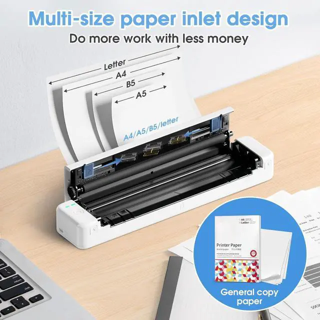 [Duplex Printing]: The P831 portable wireless printer supports duplex printing, which can help reduce paper costs. It also features a built-in stopper that adjusts the width of the paper slot, allowing for flexible printing on paper widths of 8.5" (US Letter), 8" (A4), 7" (B5), and 5.8" (A5)