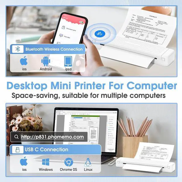 [Plain Paper Printing]: P831 Bluetooth thermal printer can print on plain paper, producing invoices, document files, receipts, architectural drawings, and more. This printer meets daily clear printing needs for laptop users in a variety of situations