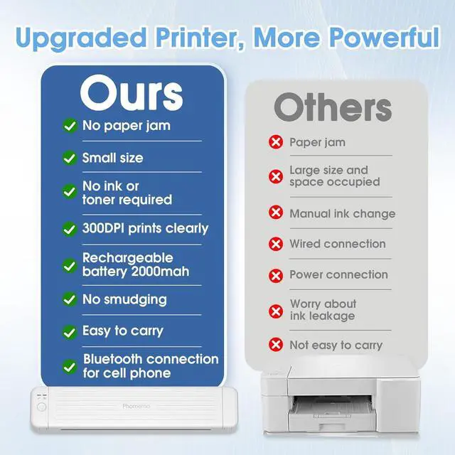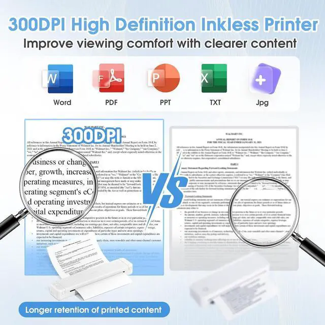 [Inkless Printing]: This portable, wireless, inkless P831 printer uses thermal transfer technology and a special ribbon. No need for ink and tonerjust replace the ribbon to be greener. It keeps text and images clearer and lasts longer than ordinary thermal printers. (Tip: Only supports single-color printing)