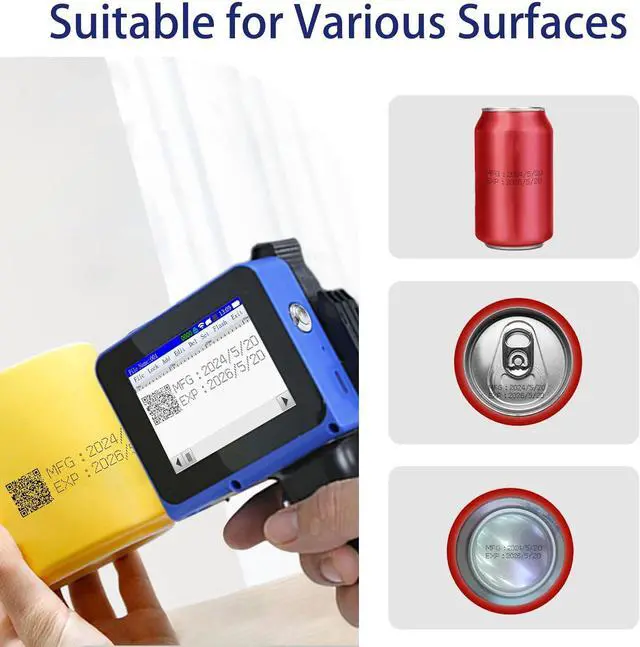 Suitable materials and surfaces: The handheld inkjet printer can print on cartons, plastic packaging, wood, paper, plastic, metal, cloth, leather, etc. The mini inkjet printer gun can also print on uneven or curved surfaces, such as plastic bottles, glass bottles, etc. It is suitable for various industries such as manufacturing, retail, warehouses, logistics, etc.