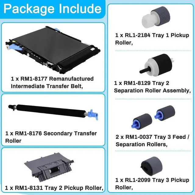 Package Includes : 1 x RM1-8177 ITB(Intermediate Transfer Belt), 1 x RM1-8176 Secondary Transfer Roller, 1 x RL1-2184 Tray 1 Pickup Roller, 1 x RM1-8129 Tray 2 Separation Roller Assembly, 1 x RM1-8131 Tray 2 Pickup Roller, 1 x RL1-2099 Tray 3 Pickup Roller,2 x RM1-0037 Tray 3 Feed / Separation Rollers, 1 x pair of gloves
