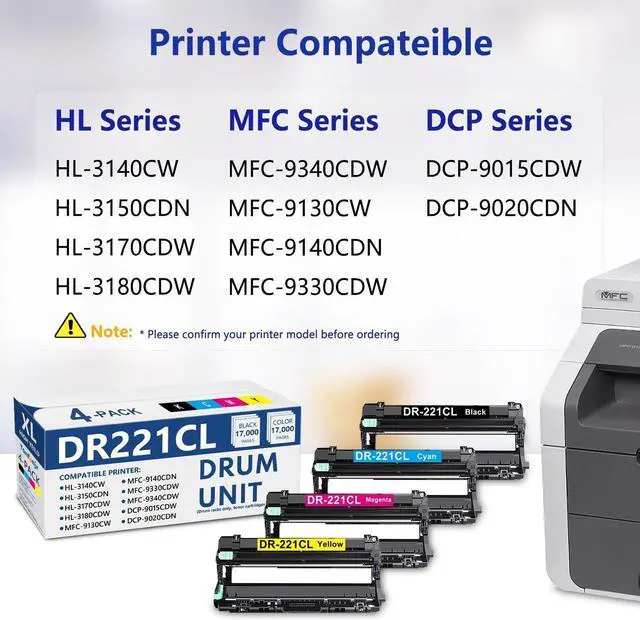 3.7 out of 5 stars DR221 DR221CL Drum Unit Set 4 Pack Replacement for Brother DR-221CL DR-221CL-BK Drum Unit for HL-3140CW HL-3170CDW HL-3180CDW MFC-9330CDW MFC-9130CW Printer (Only Drum, Not Include Toner)