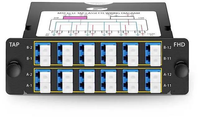 • FHD Fiber TAP Cassette, OS2, 12 x LC Duplex Live Ports, 2 x MTP-12 Male Live Ports, 2 x MTP-12 Male TAP Ports, 70/30 Split Ratio