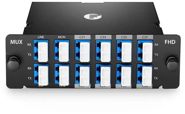 • 8CH DWDM Dual-fiber Mux/Demux, C21-C28, MON/EXP/1310nm Ports, FHD Plug-in Module
