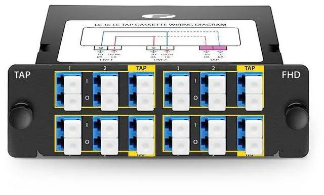 • FHD Fiber TAP Cassette, OS2, 8 x LC Duplex Live Ports, 4 x LC Duplex TAP Ports, 50/50 Split Ratio